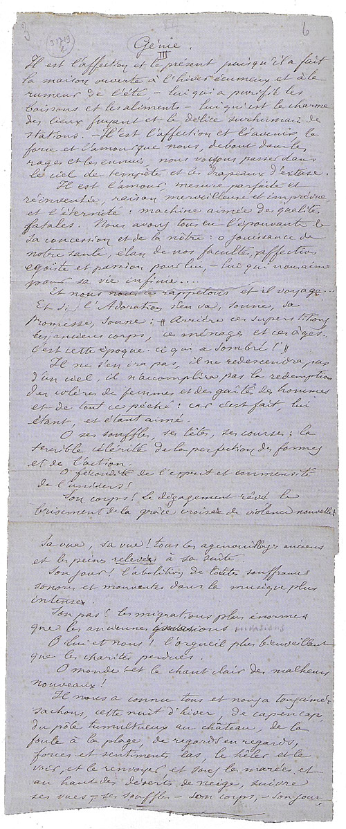 彼は愛それが実在すると言えるのは実際鳥肌の立つ冬に館を開け放ちしかも夏の噂によれば、彼が飲み物と食料を清め、彼は魅惑の逃走であり立ち寄る静養地での超人的な悦楽でもある。彼は情愛であり未来、その力と愛はわれらを、怒りと当惑の渦に巻き込み、われらは遠い天の嵐のなかにエクスタシーの旗印を見る。 彼は愛情、完璧に作り直された尺度、最善の判断力の意外性、そして永遠(マシーンは宿命的にその性能で愛されるもの) われらは払い下げ品に戦慄した(おお われらの健康の享受、われらの能力の躍進、エゴイズムと彼への情熱、彼はわれらに愛された無限の生活なのだ。。。) そしてわれらは互いに呼びかけ合い彼の旅へ。。。でも崇拝が去ろうものなら、声が、あのお決まりの声が、「どきやがれそんな迷信、古ぼけた肉体、そんな夫婦にそんな世代ども、そいつぁこの時代に沈没したんだ!」 彼はどこにも行きゃしない、彼はどこかの天国から再臨したりしない、彼は魂の救済を成就しないよあの女たちのかんしゃくや男たちの騒動やその他の罪を(なぜなら明白な事実として、彼は「いる」、しかも愛されて) おお彼の息吹、彼の触手、彼の疾走は? 恐るべき速さで完成する形態のアクション。 おお肥沃な精神と広大な宇宙! 彼の肉体! 請け戻した夢、砕け散った十字形の恩寵による新しい暴力だ! その視力、その視力! すべて古来からの跪拝で強められた苦痛を次々に。 彼の一日! すべての不快な夾雑音を禁止してより強烈な音楽で打ち消す。 彼の歩み! その移動はいにしえの侵略より途方もない。 おお彼とわれら! その傲慢さも失われた慈愛よりは親切。 おう世界よ! 澄んだ歌声 新しい逆境! 彼われらのすべてを知りわれらすべてを愛した。知らせてよ、この冬の夜、岬から岬、揺籃する地軸から城、人ごみの岸辺、目を見張り、力と感情が失せたら、呼びかけ訪れ、そして復帰させ、海流の下そして高い雪の砂漠、ついて行こう彼の視界、彼の息吹、彼の肉体、彼の一日。 |